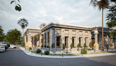 The architectural design incorporates traditional elements, such as grand columns and arches, paired with modern perforated panels and lighting, symbolizing a seamless blend of past and present.