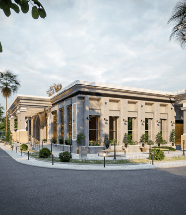 The use of perforated panels, strategically placed lighting, and natural materials creates an interplay of light and shadows that enhances the building’s elegance and invites a sense of openness.