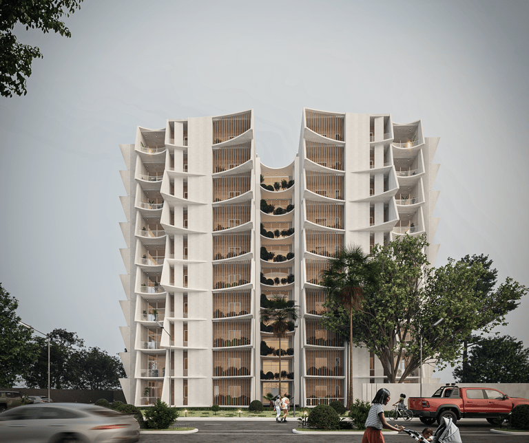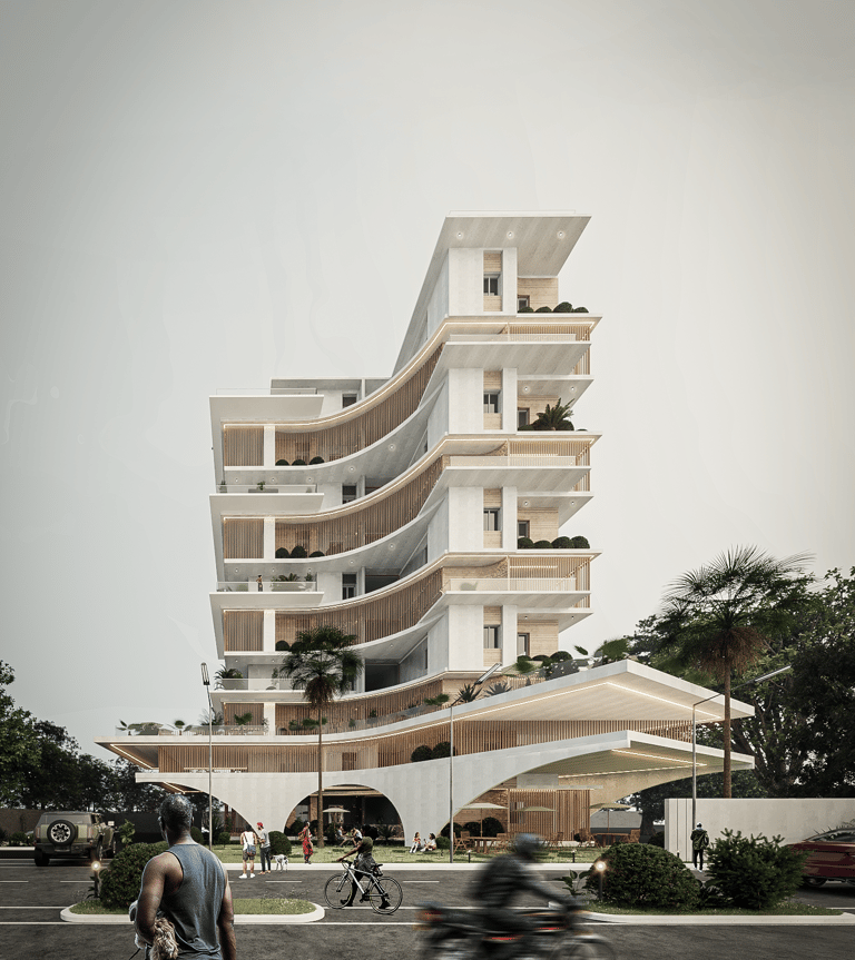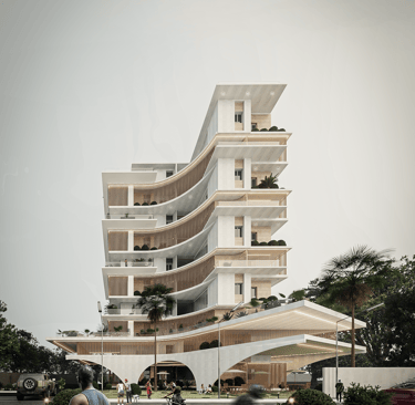 Organic Curves and Cascading Terraces: The architecture employs flowing, curved forms and layered terraces that harmonize with the environment while providing functional open spaces.