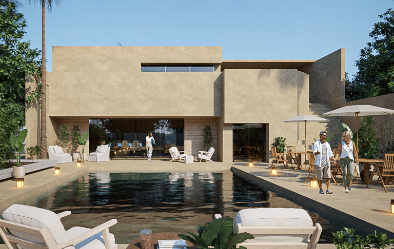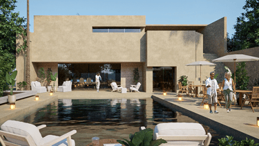 Outdoor Serenity: The home opens to a wide entrance leading to a luxurious pool area complemented by shaded lounging spaces and lush greenery. An additional pool enhances the ambiance, offering a perfect escape for relaxation and entertaining.